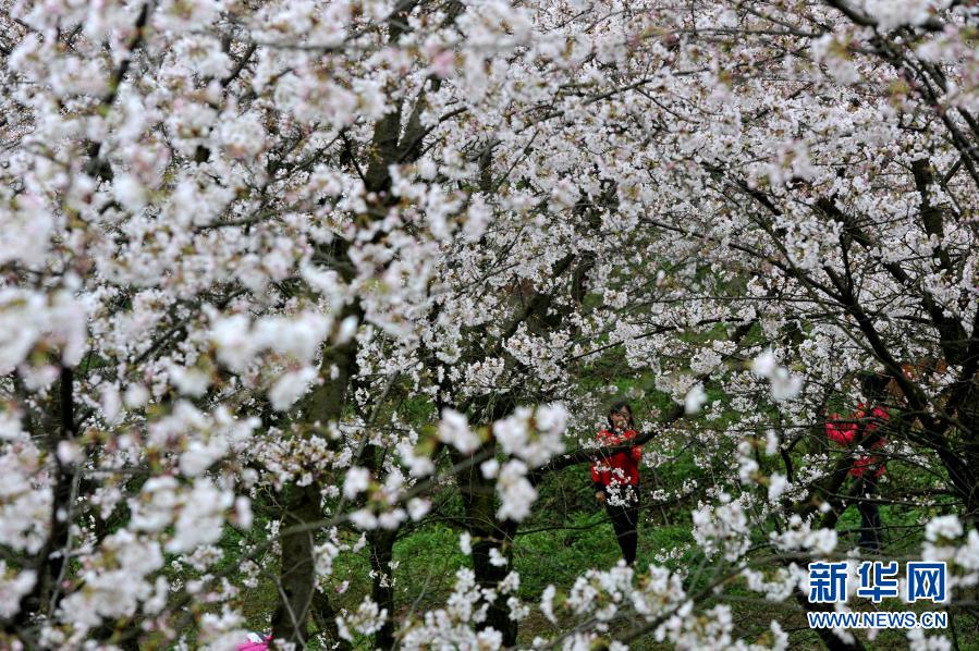 春季里,貴州省貴安新區紅楓湖畔的櫻花園內櫻花綻放,花海如云似雪,吸引游人踏春賞櫻。