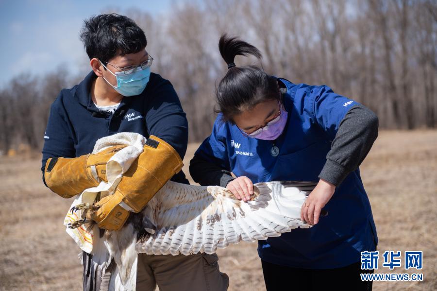 3月20日,北京猛禽救助中心猛禽康復(fù)師戴暢(右)和周蕾在放飛大鵟前對(duì)其進(jìn)行最后的檢查。新華社記者 陳鐘昊 攝