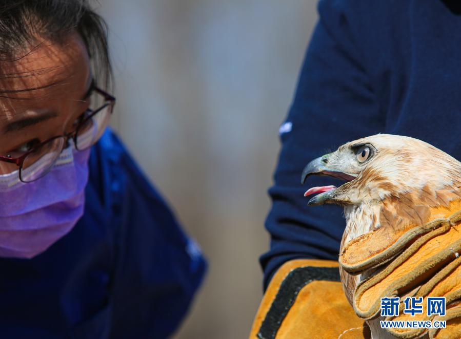 3月20日,北京猛禽救助中心猛禽康復師戴暢在放飛大鵟前進行最后的檢查。新華社記者 李京 攝