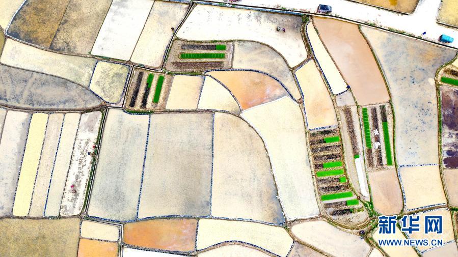 3月24日,廣西河池市東蘭縣武篆鎮色故村農民在田間勞作(無人機照片)。