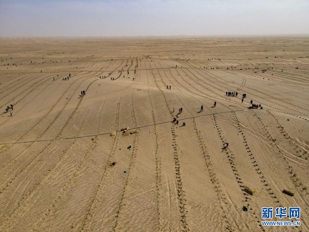 這是在新疆且末縣城不遠(yuǎn)處的塔克拉瑪干沙漠內(nèi)植樹的群眾(3月28日攝,無(wú)人機(jī)照片)。新華社記者 高晗 攝