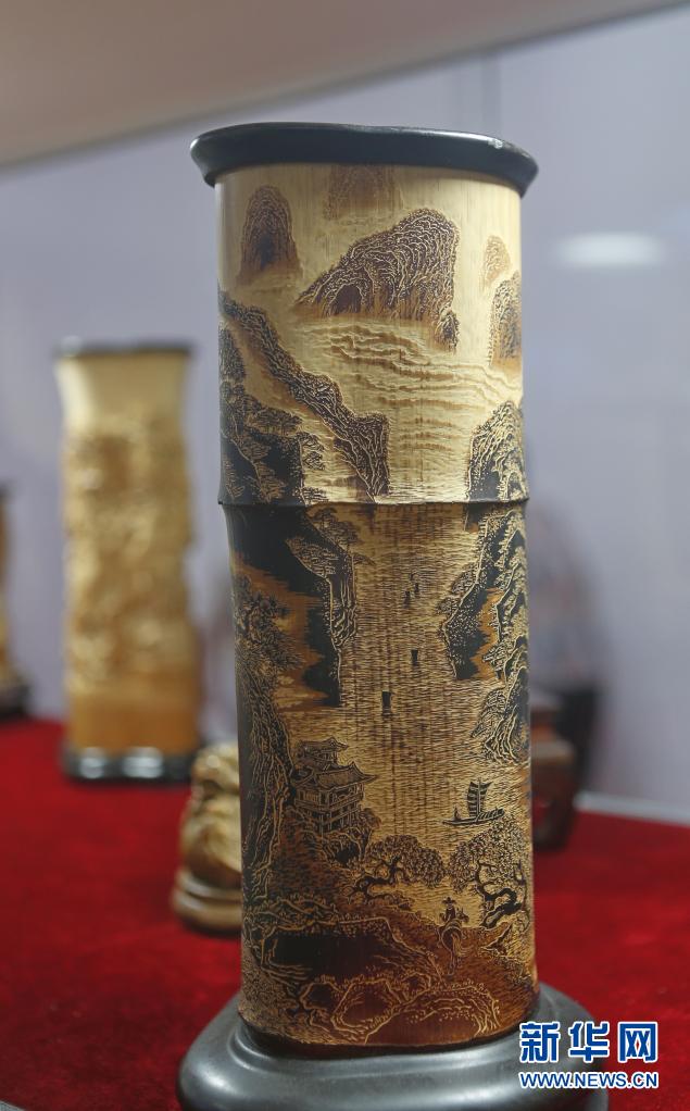 這是5月9日在消博會(huì)拍攝的竹雕筆筒。新華社記者 丁洪法 攝