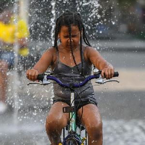 6月17日,在德國(guó)法蘭克福,一名小朋友騎車穿過(guò)噴泉納涼。