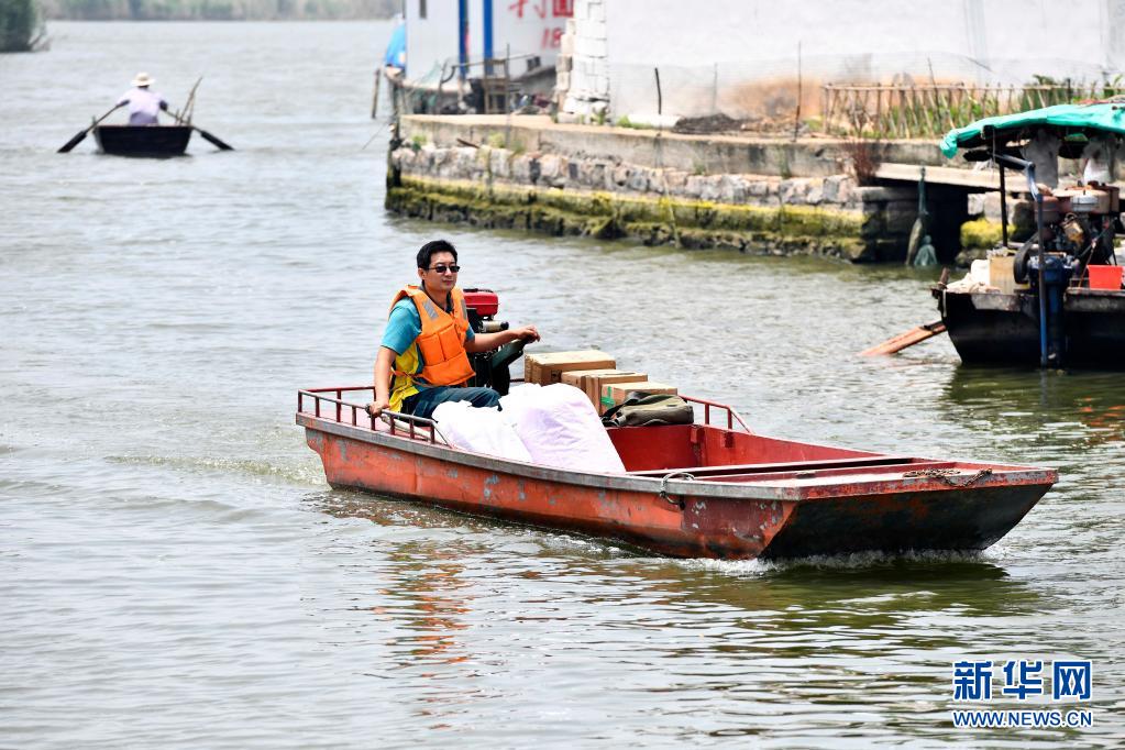 6月20日,在微山縣南陽鎮,郵遞員王少朋駕駛郵船為柳溝村村民投遞郵件。
