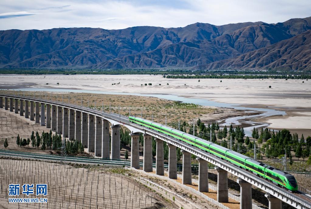 試運行的復興號列車行駛在雅魯藏布江畔(6月16日攝)。