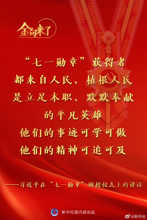 習近平說,“七一勛章”獲得者都來自人民、植根人民,是立足本職、默默奉獻的平凡英雄。他們的事跡可學可做,他們的精神可追可及。他們用行動證明,只要堅定理想信念、堅定奮斗意志、堅定恒心韌勁,平常時候看得出來、關鍵時刻站得出來、危難關頭豁得出來,每名黨員都能夠在民族復興的偉業中為黨和人民建功立業!