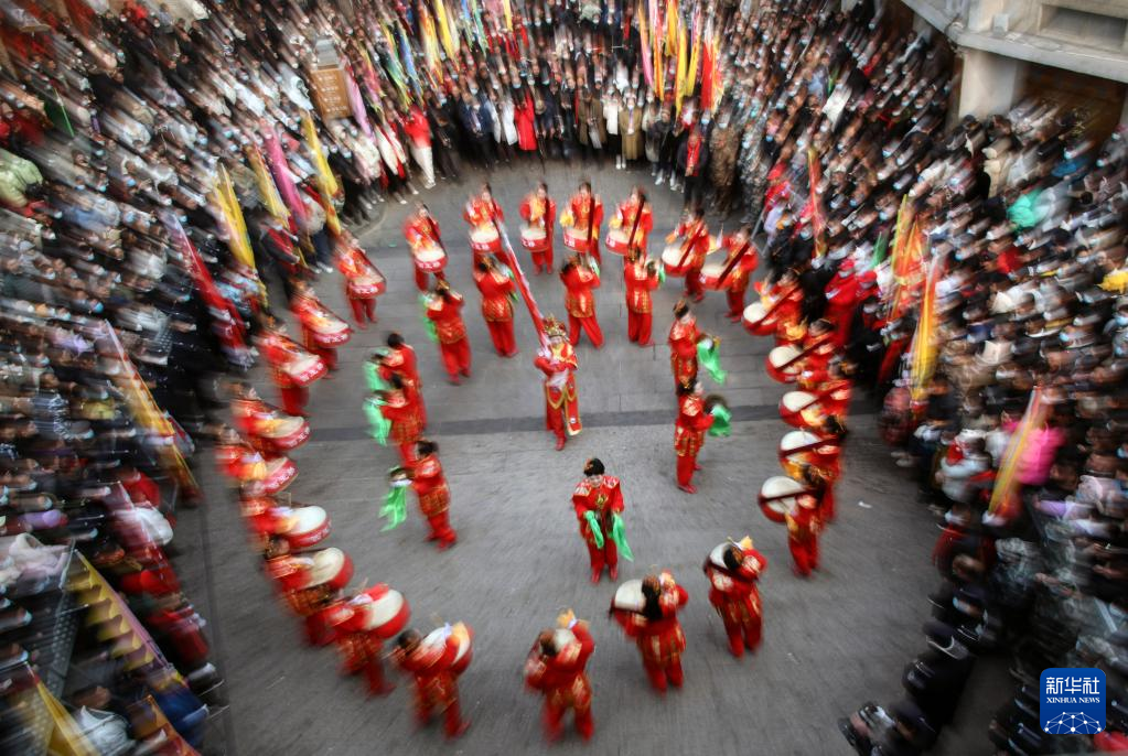 2月6日,社火团队的演员在庙会上表演(无人机照片)。