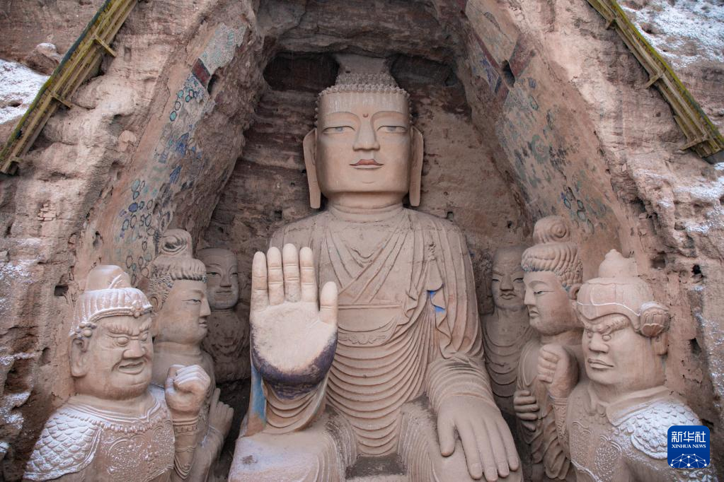 当日,位于甘肃省武威市凉州区的天梯山石窟迎来一场降雪。在皑皑白雪映衬下,窟区造像与原野山川构成一幅宁谧而优美的画卷。