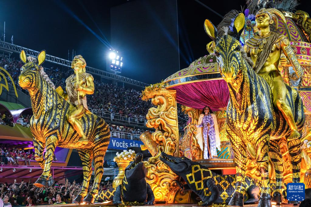 2月26日凌晨,在巴西里约热内卢桑巴大道,花车参加狂欢节游行。