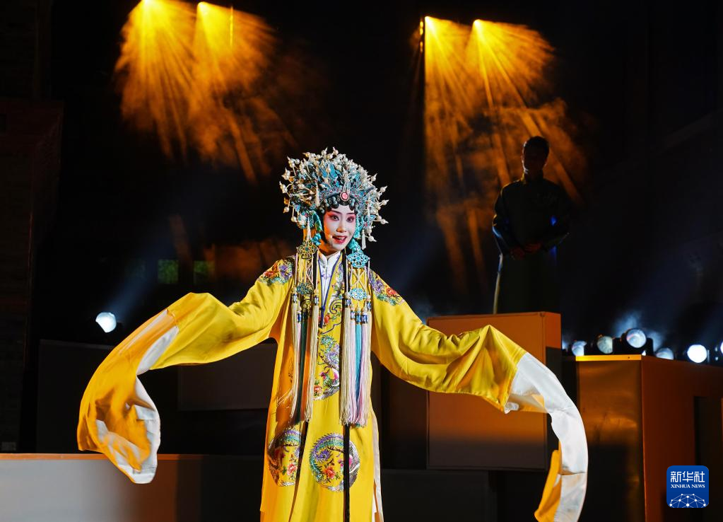 优秀历史建筑“三联排”在声光影效果中,成为如梦似幻的戏曲舞台(4月14日摄)。