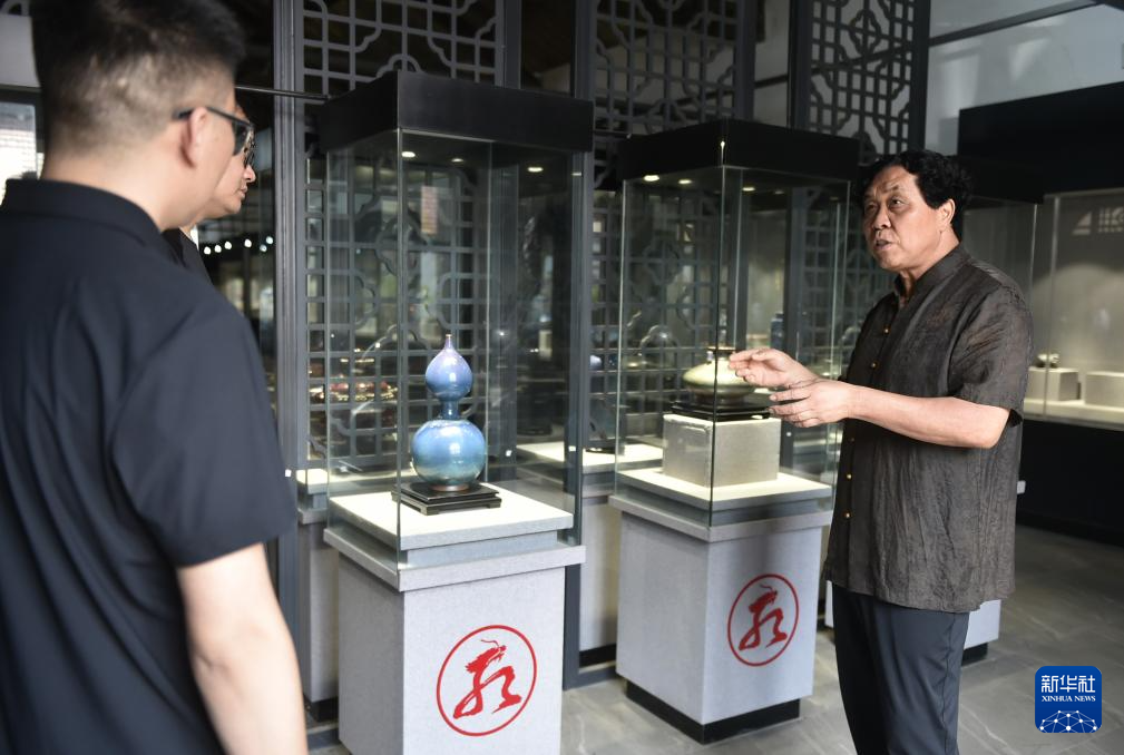 8月3日,河南省禹州市神垕镇一家钧瓷企业的工作人员在展厅里向来访者介绍钧瓷作品。