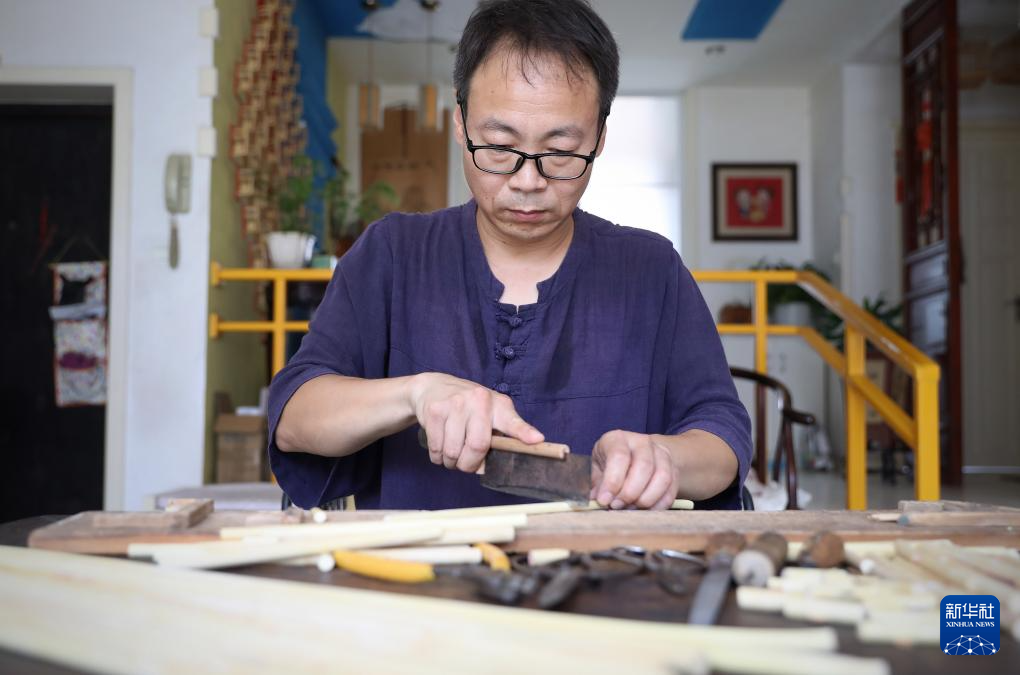 8月17日,崔凯在辽宁省营口市自己家中打磨吉祥轮彩纸风车骨架。