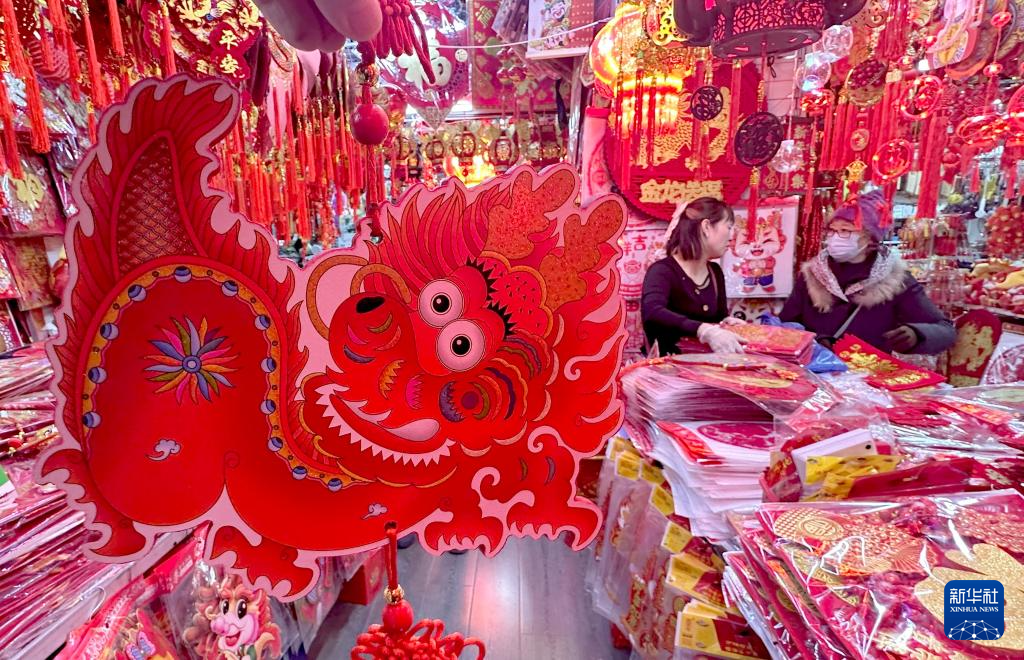 1月19日,人们在河南省开封市年货批发市场选购春节饰品。