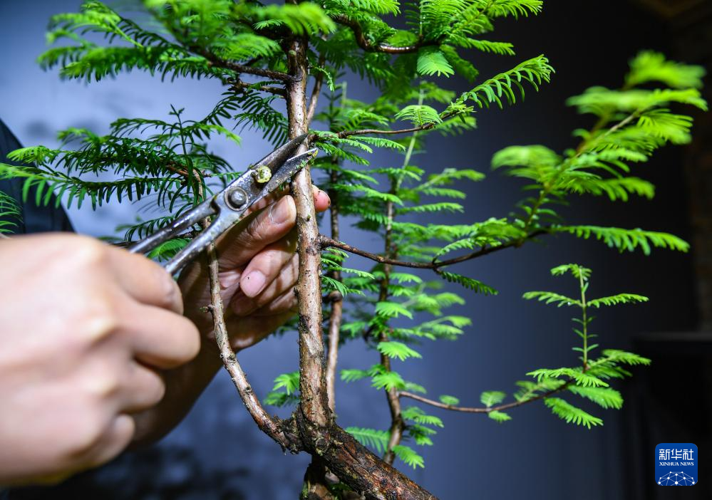 5月2日,在四川省成都市温江区,陈宏宇在工作室对盆景进行修枝。