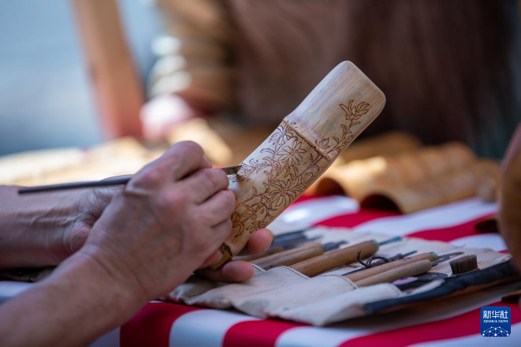 6月8日,手工艺人在福建武夷山市向游客展示武夷竹刻制作技艺。