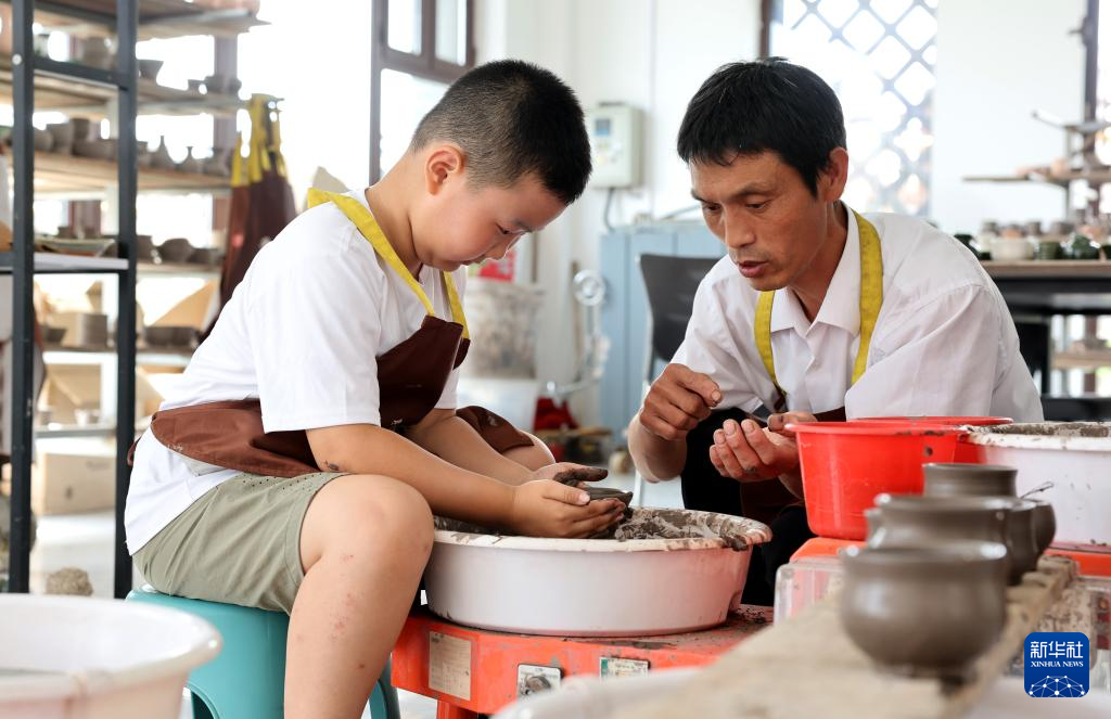 6月8日,在河北省石家庄市井陉县南横口村,小朋友在陶艺师的指导下进行陶艺制作。