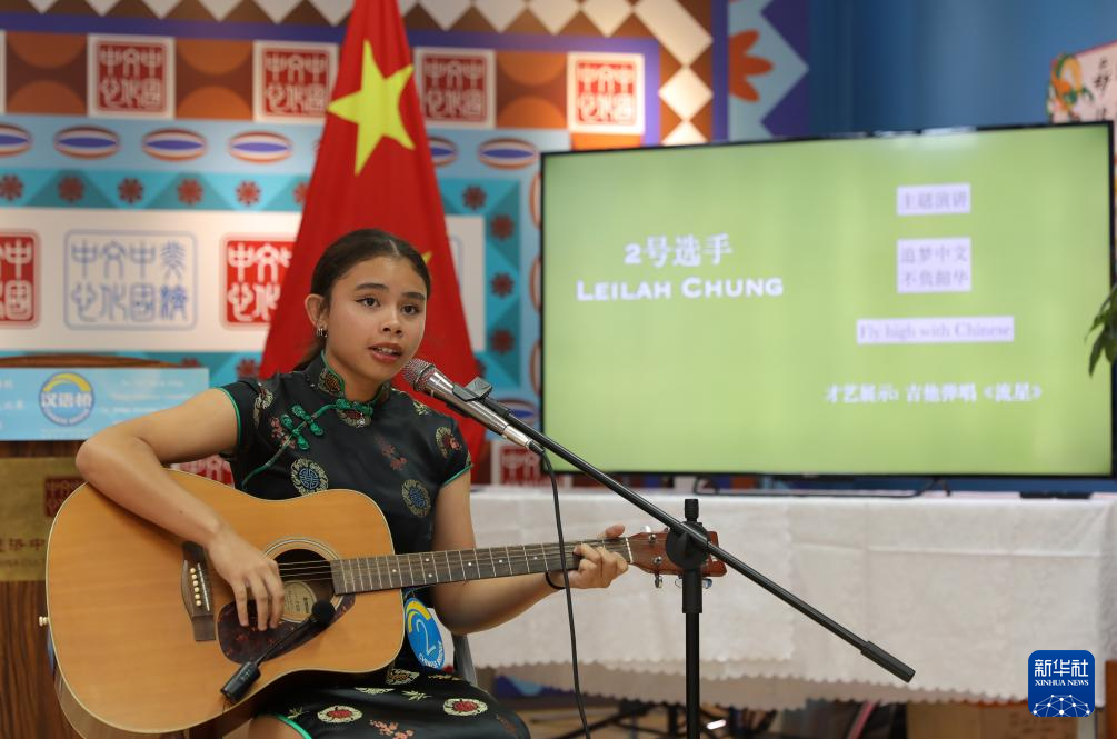 6月8日,在斐济首都苏瓦举行的“汉语桥”世界中学生中文比赛斐济赛区决赛上,选手在表演环节演唱中文歌曲。