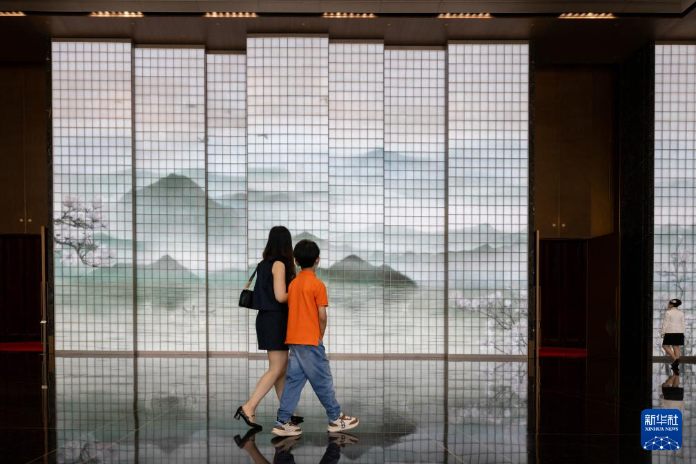6月16日,市民经过上海世界会客厅内的琉璃多媒体艺术装置墙。