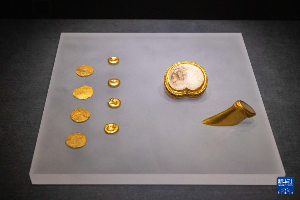 6月25日在“大汉未央——汉代王室精品文物展”上拍摄的汉代黄金制品。