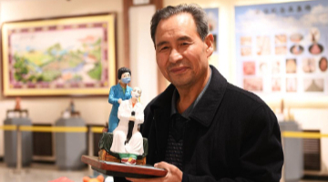 11月4日,黎族老人在位于海南保亭的槟榔谷文化旅游区展示黎族织锦绕线技艺。