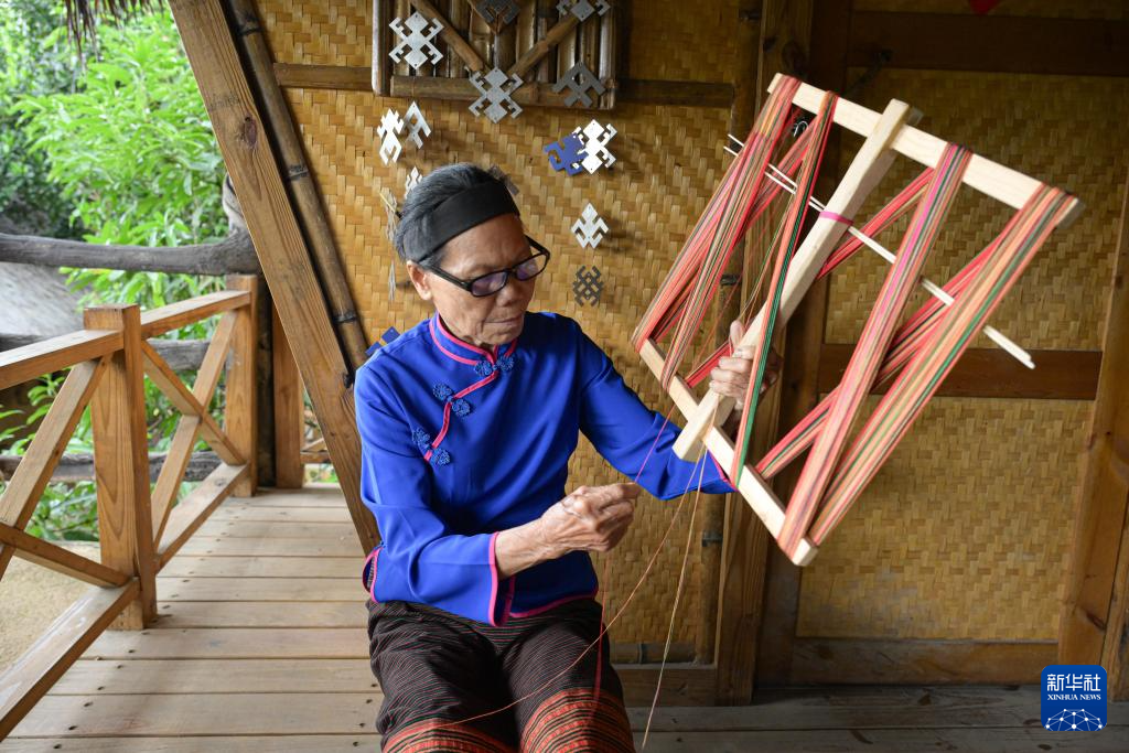 11月4日,黎族老人在位于海南保亭的槟榔谷文化旅游区展示黎族织锦技艺。