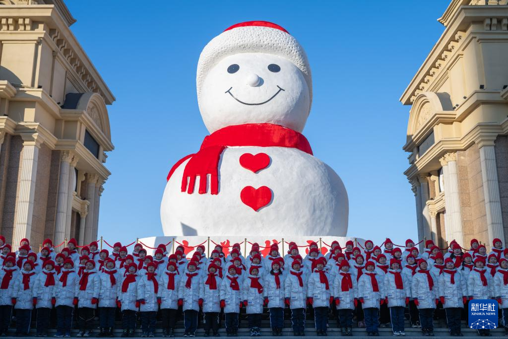 12月17日,小学生在哈尔滨松花江畔的大雪人前表演。
