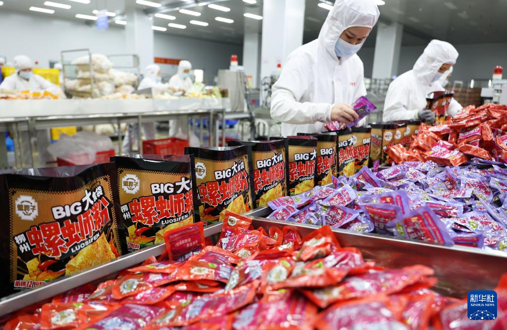 柳州市螺蛳粉产业园一家螺蛳粉生产企业工作人员在包装螺蛳粉(11月13日摄)。