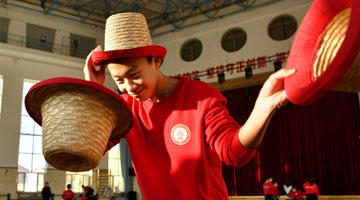 12月19日,在日本东京都的中央大学,学生们举着自己制作的木版水印画合影。