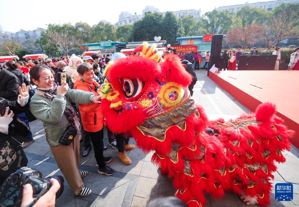 12月31日,舞狮队在年货节现场与市民游客互动。