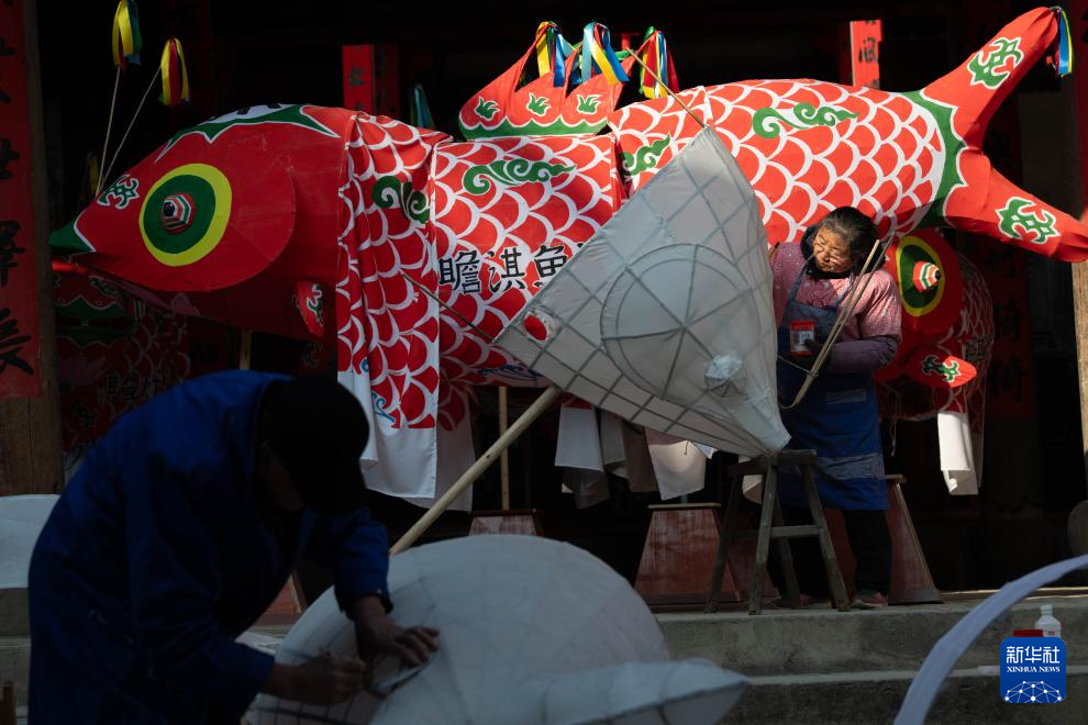 1月6日,在安徽省黄山市歙县北岸镇瞻淇村一处祠堂里,村民在制作鱼灯。