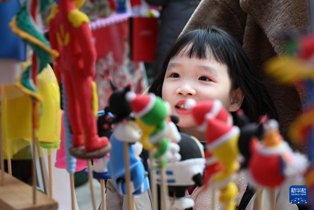 1月19日,一名小朋友在社区庙会上看捏泥人。