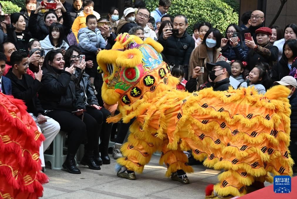 1月19日,居民在社区庙会上观看舞狮表演。