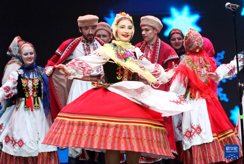 1月20日,在白俄罗斯首都明斯克,白俄罗斯学生在中白学生春节联欢晚会上表演民族歌舞。