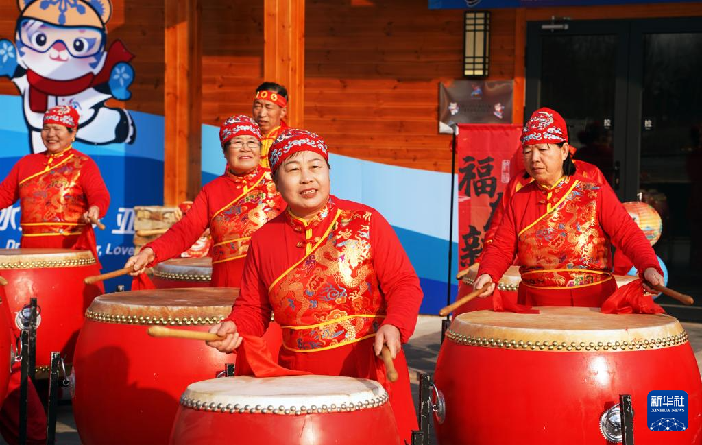 1月23日,在北京通州区台湖镇迎新春传统市集上,当地村民表演威风锣鼓。
