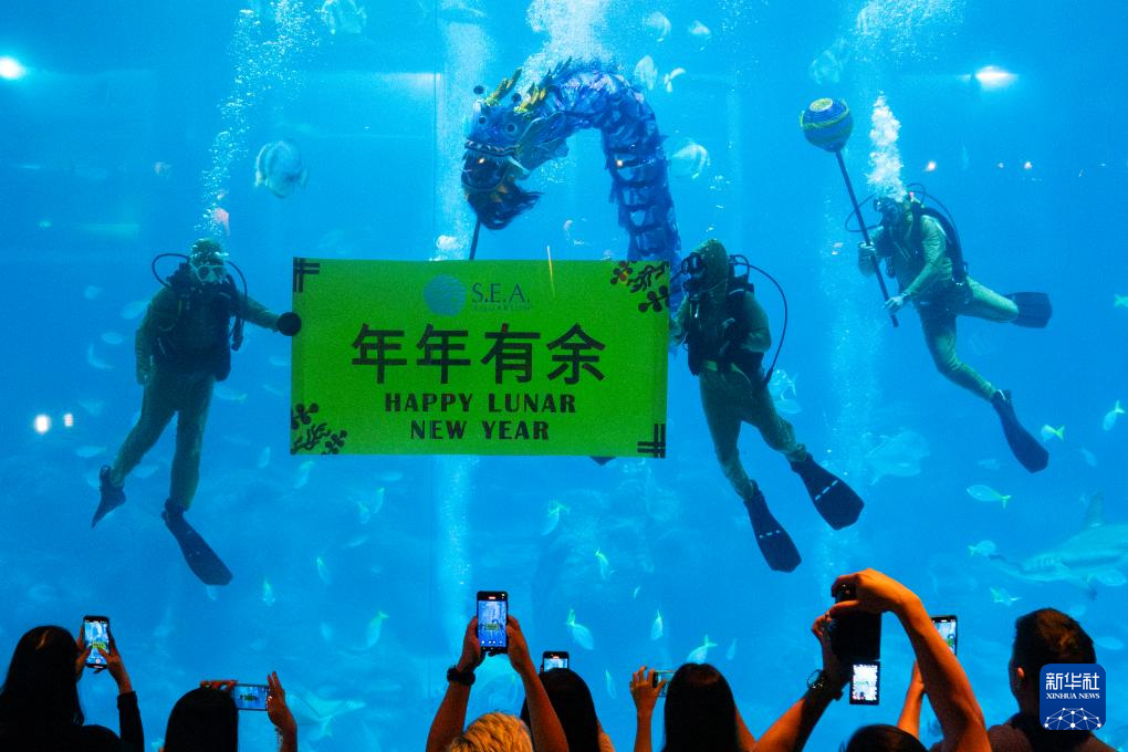 1月20日,潜水员在新加坡S.E.A.海洋馆表演水下舞龙。