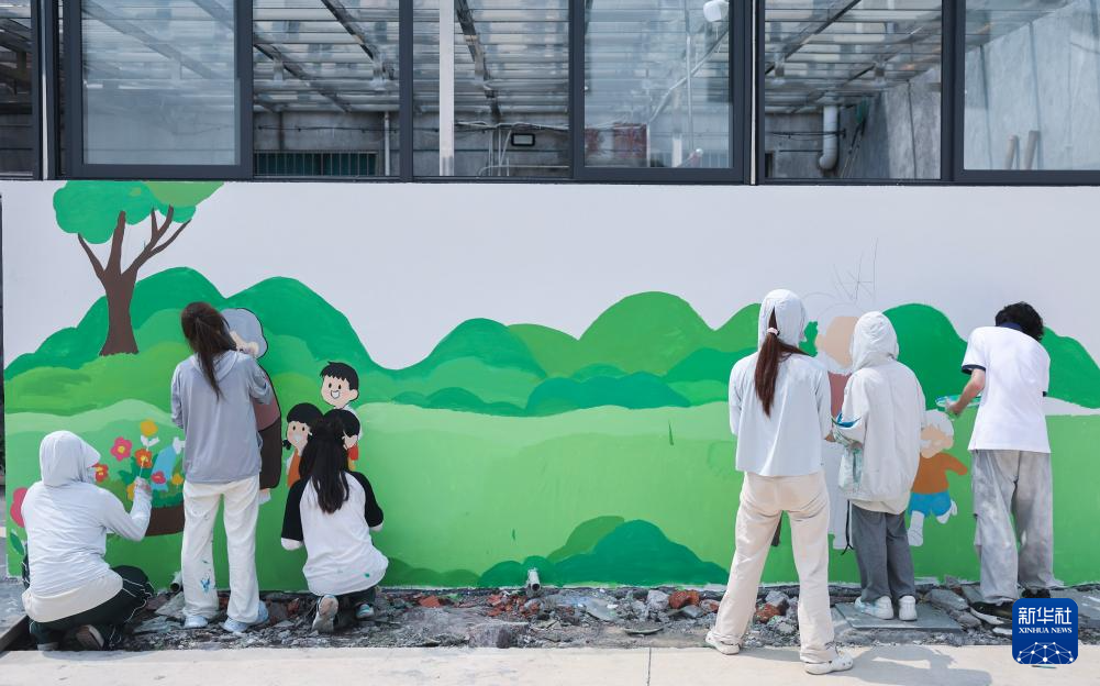 7月15日,在诸暨市安华镇丰江周村,浙江农林大学暨阳学院设计专业的学生们创作墙绘,美化乡村人居环境。