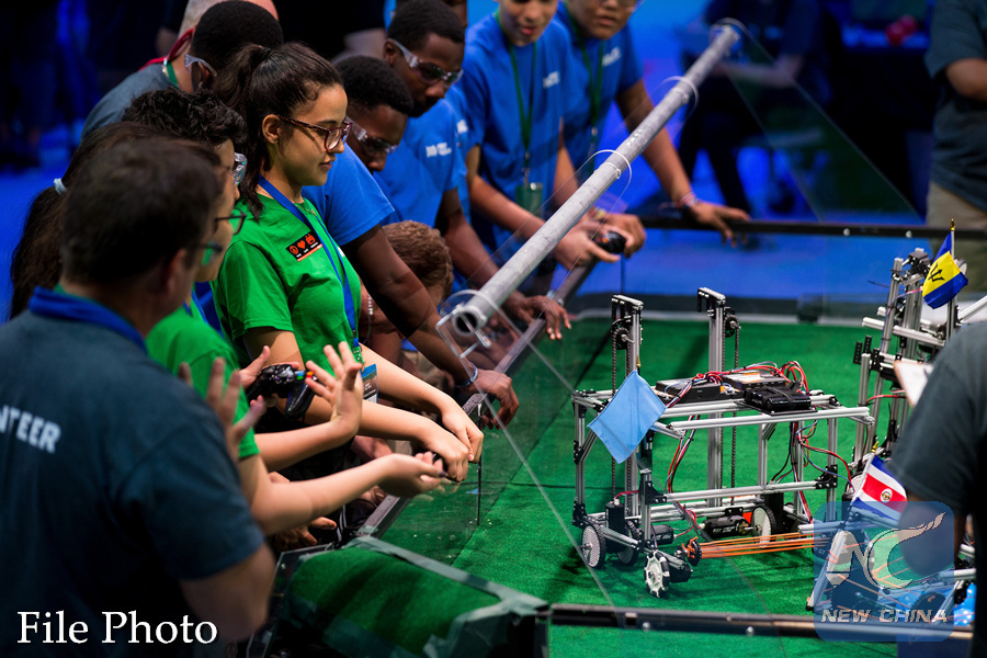 Students prepare their robots during a competition of First Global Challenge 2017, in Washington D.C., the United States, on July 17, 2017. (Xinhua/Ting Shen)