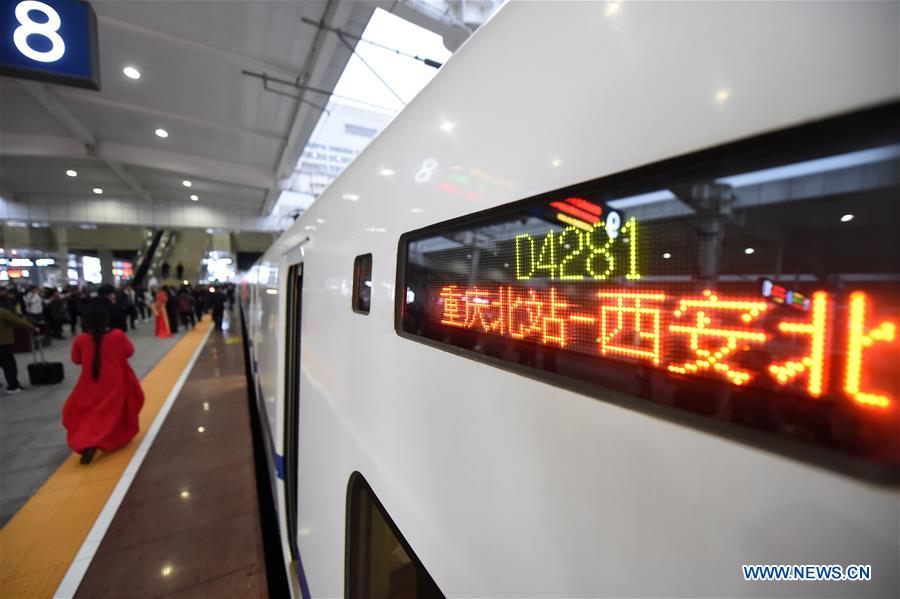 A bullet train prepares to leave for Xi'an, capital of northwest China's Shaanxi Province, at the Chongqingbei Railway Station in southwest China's Chongqing Municipality, Dec. 6, 2017. High-speed trains linking Xi'an and Chongqing, began operation on Wednesday, slashing the travel time between the two cities from 9.5 hours to just 5.5. The new route includes a new section of the high-speed rail line linking Xi'an with Chengdu, capital of southwest China's Sichuan Province, which also started operation on Wednesday. (Xinhua/Tang Yi)