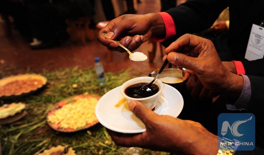 File photo shows guests taste traditional Ethiopian coffee at the coffee and music corner in the venue of the 16th Ordinary Session of the Assembly of the African Union, in Addis Ababa, Ethiopia, Jan. 31, 2011. (Xinhua/Zhao Yingquan)