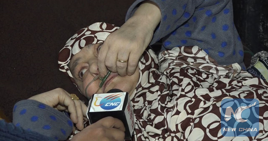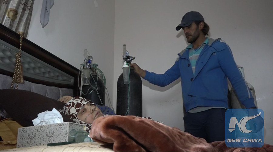 Rabeeha al-Assar, 54, suffers from pulmonary fibrosis, which forces her to take oxygen therapy around the clock. (Xinhua photo)
