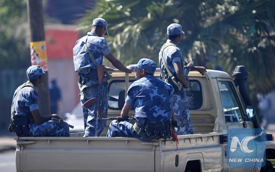 File photo shows security personnels patrol on the street in Addis Ababa, Ethiopia, Jan 29, 2011. (Xinhua/Zhao Yingquan)
