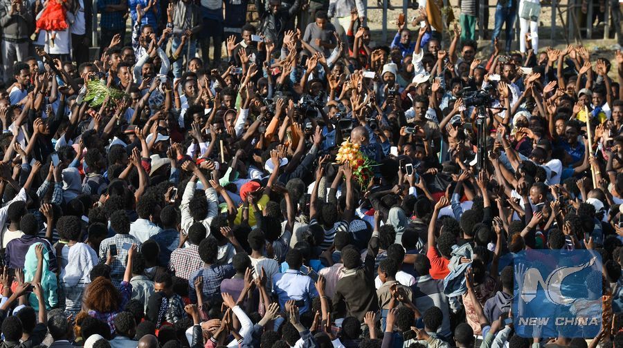 Supporters of Ethiopian opposition leader Merera Gudina take part in a demonstration along the streets of Addis Ababa, capital of Ethiopia, Jan. 17, 2018. (Xinhua/Michael Tewelde)