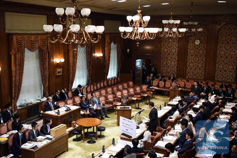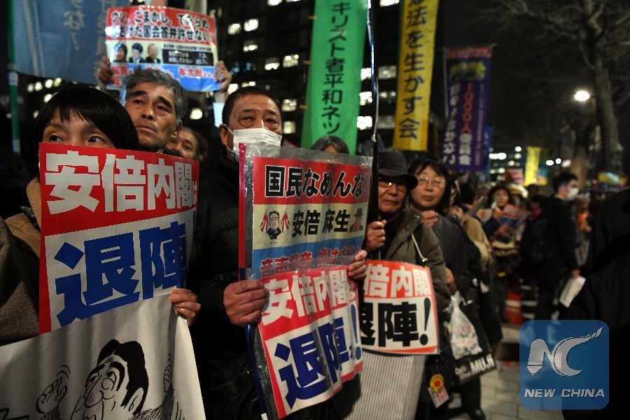 TOKYO, March 20 (Xinhua) -- Japanese Prime Minister Shinzo Abe has been under fire amid a deepening cronyism and document-tampering scandal, which has drastically brought down his cabinet's approval ratings, while people staged protests across Japan calling for the cabinet's resignation.