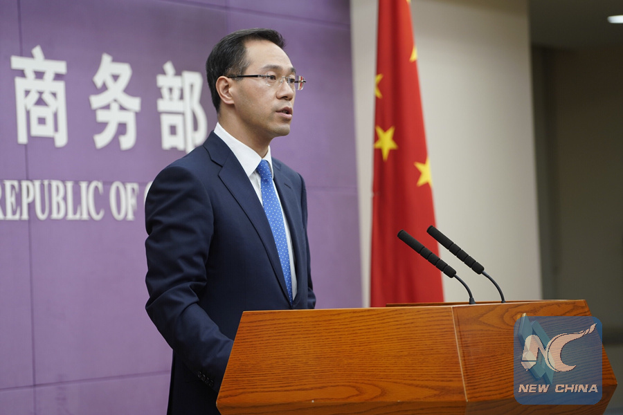 Gao Feng, spokesperson with China's Ministry of Commerce, speaks at a press conference in Beijing, capital of China, on April 6, 2018. (Xinhua/Xing Guangli)