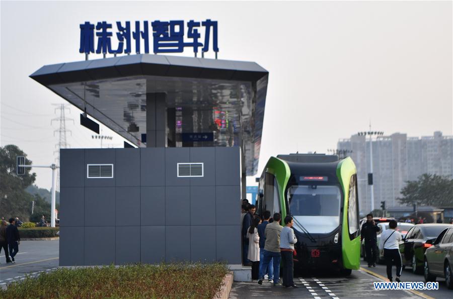 Citizens take a smart bus during the test run in Zhuzhou, central China's Hunan Province, Oct. 23, 2017. The test run of the ART, Autonomous Rail Rapid Transit, started in Zhuzhou on Monday. The ART is developed by the research arm of CRRC Zhuzhou Locomotive Co., Ltd., which produces key parts for China's high-speed railway. The bus is about 30 meters long and equipped with sensors that can read the dimensions of roads and plan its own route. (Xinhua/Xue Yuge)