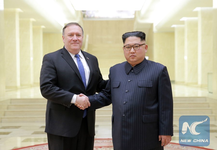 Photo provided by the Korean Central News Agency (KCNA) on May 10, 2018 shows Kim Jong Un (R), top leader of the Democratic People's Republic of Korea (DPRK), shaking hands with visiting U.S. Secretary of State Mike Pompeo on May 9, 2018. (Xinhua/ KCNA)