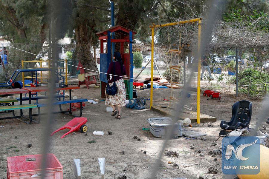 An Israeli journalist inspects the damage in a kindergarten yard, after mortar shells fired from the Gaza Strip exploded near it, in the southern Israeli Kibbutz of Ein Hashlosha on May 29, 2018. (AFP photo)