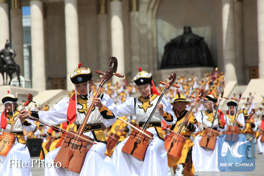 Photo shows a grand traditional Morin Khuur performance held on the eve of Mongolian Naadam festival for National Day on Sukhbaatar Square in Ulan Bator, Mongolia, July 5, 2011. (Xinhua/Huang Longjie)
