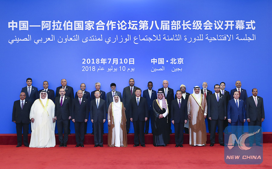Chinese President Xi Jinping (C, front) poses for group photos with Kuwaiti Emir Sheikh Sabah Al-Ahmad Al-Jaber Al-Sabah (6th L, front) and heads of delegations to the eighth ministerial meeting of the China-Arab States Cooperation Forum in Beijing, capital of China, on July 10, 2018. (Xinhua)