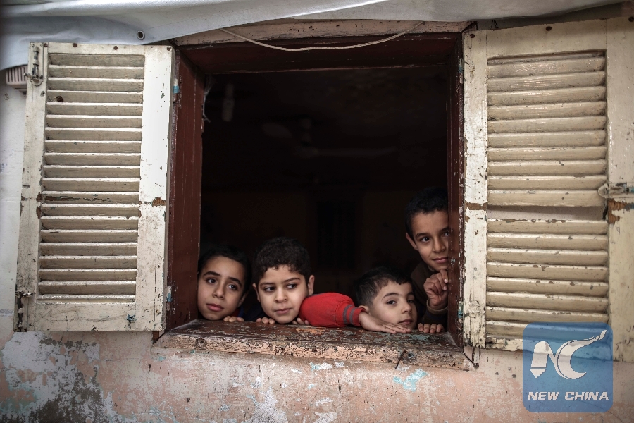 Members of Abu Amer family of Palestine living in difficult conditions look out from their slum's window, in Nuseirat Refugee Camp, central Gaza Strip, on Jan. 11, 2018. (Xinhua/Wissam Nassar)